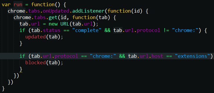 Hàm đầu tiên để khóa các tab có protocol bắt đầu bằng chrome:, có thể đoán được là muốn ngăn người dùng truy cập chrome://extension để gỡ bỏ extension này.